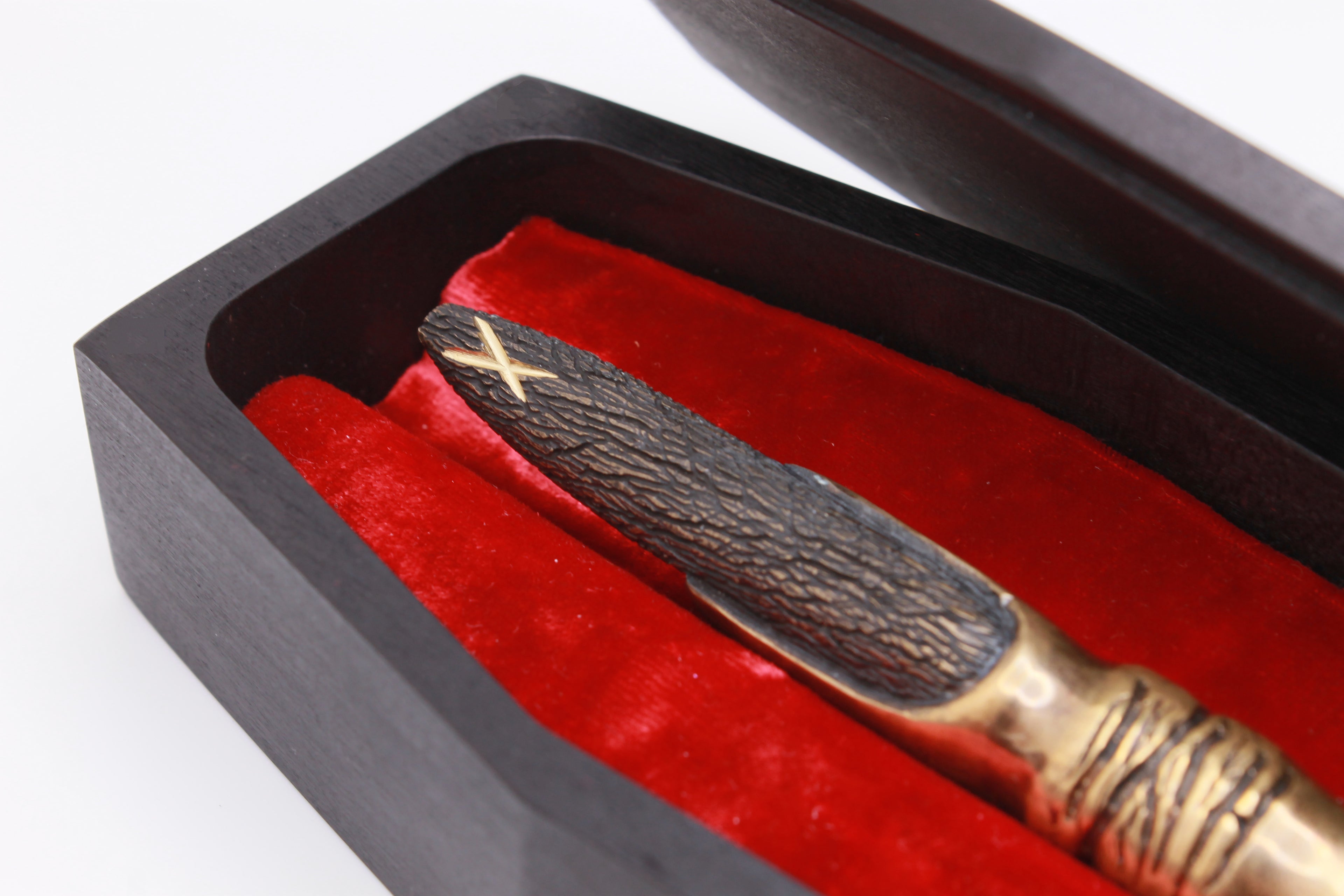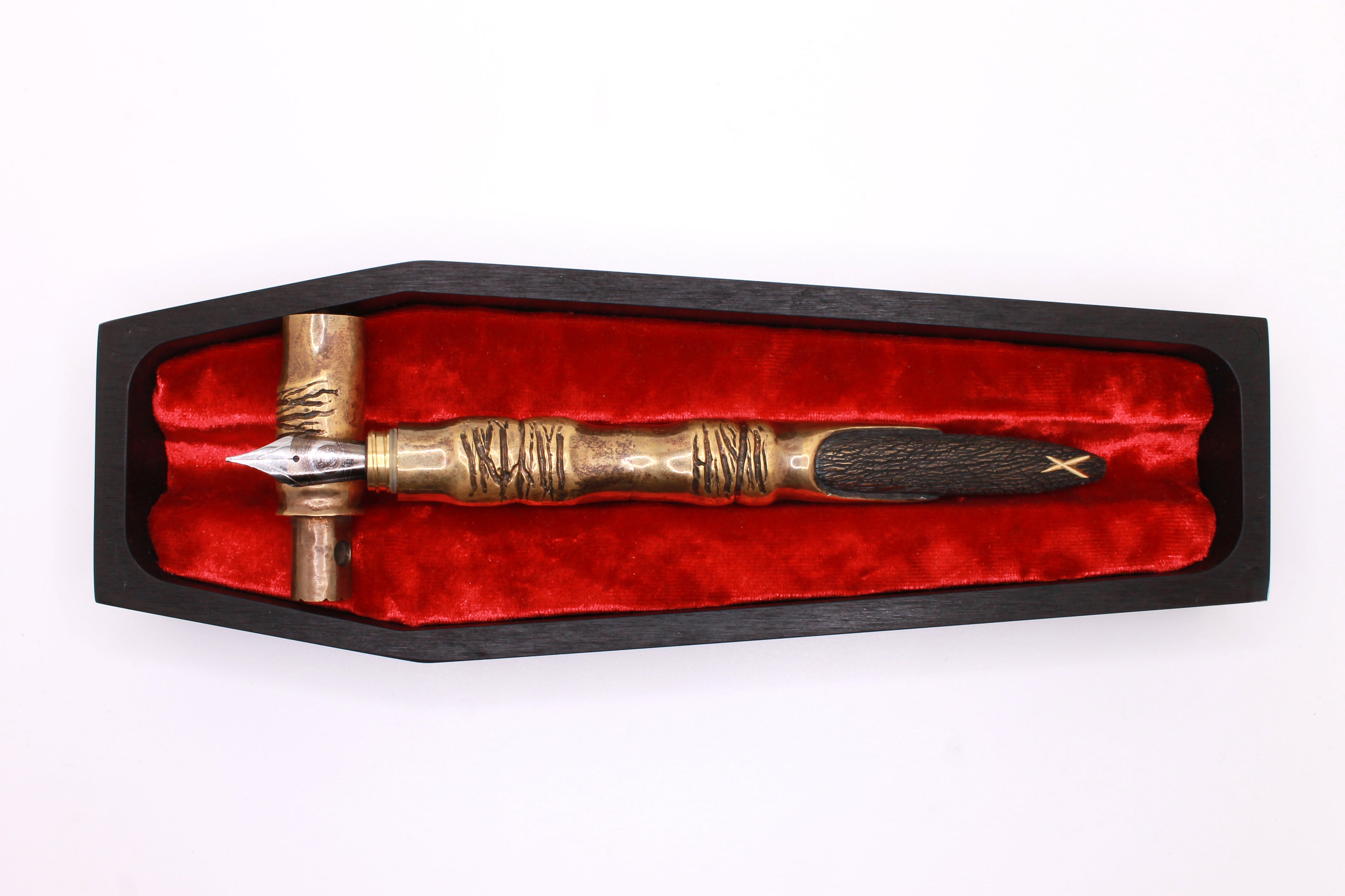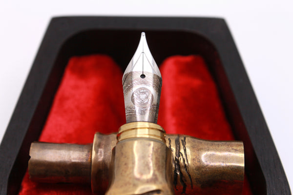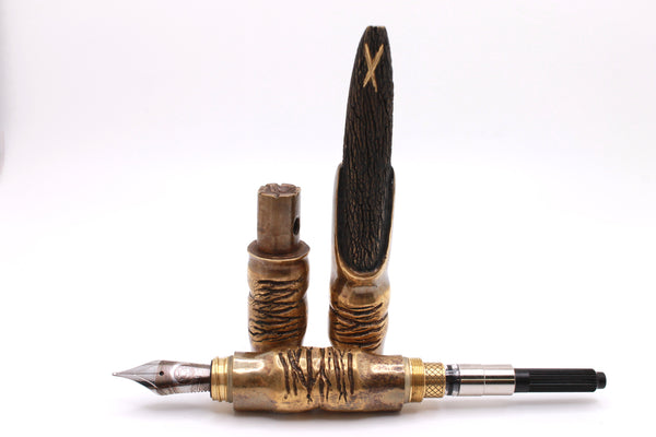 The pens are carved from solid brass unless otherwise specified, and have the numbered Certificate of Authenticity laser engraved on the brass sleeve that holds the nib in place inside the pen.