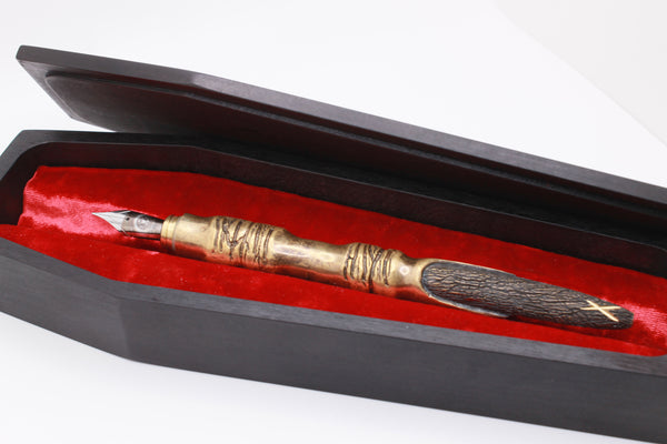 This model comes with a JoWo #6 nib with a special collaboration logo featuring an eye with a reflection of our Scribbles squirrel logo, and a wood coffin display box made to complement the unique aesthetic of this pen.