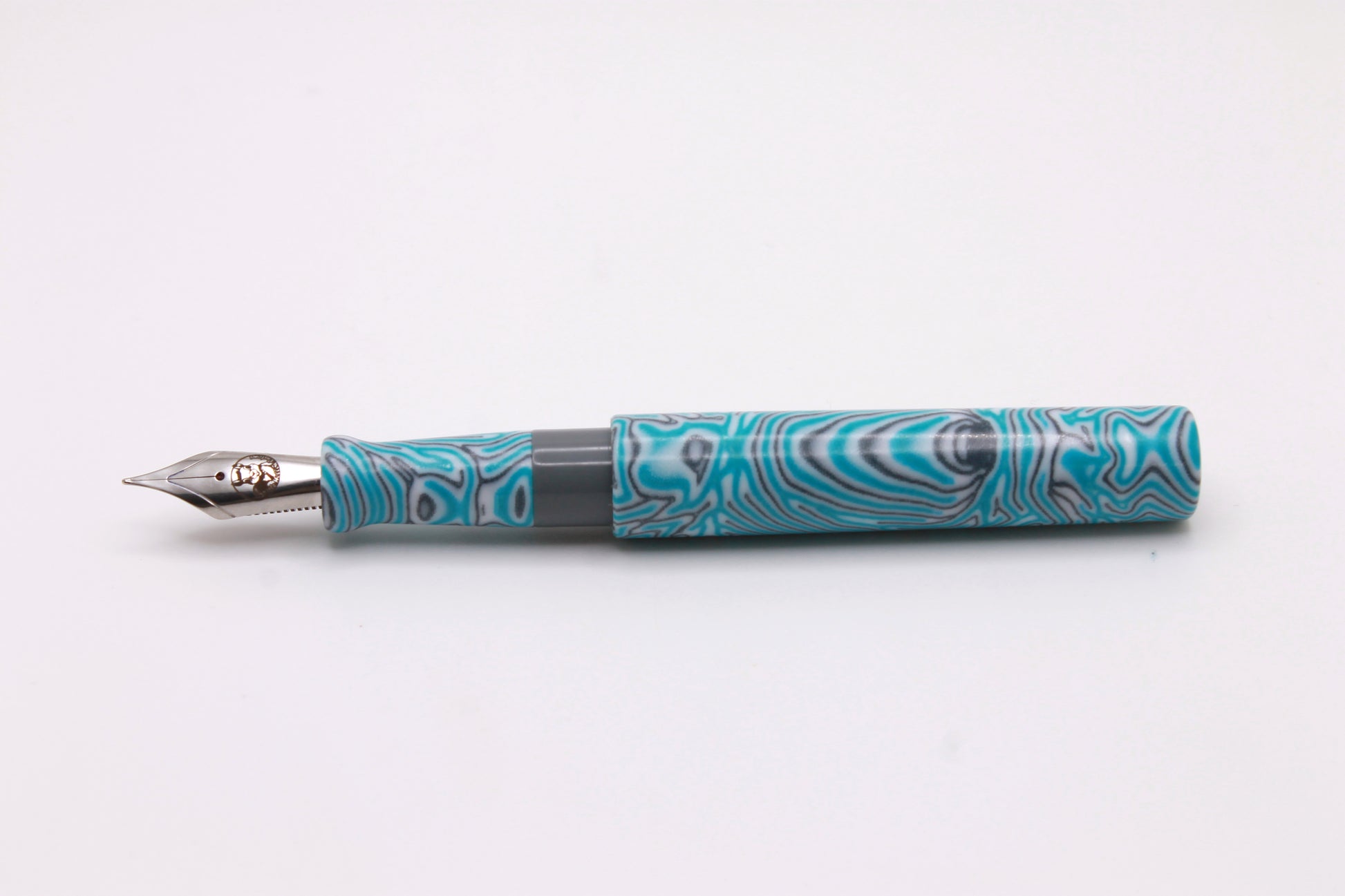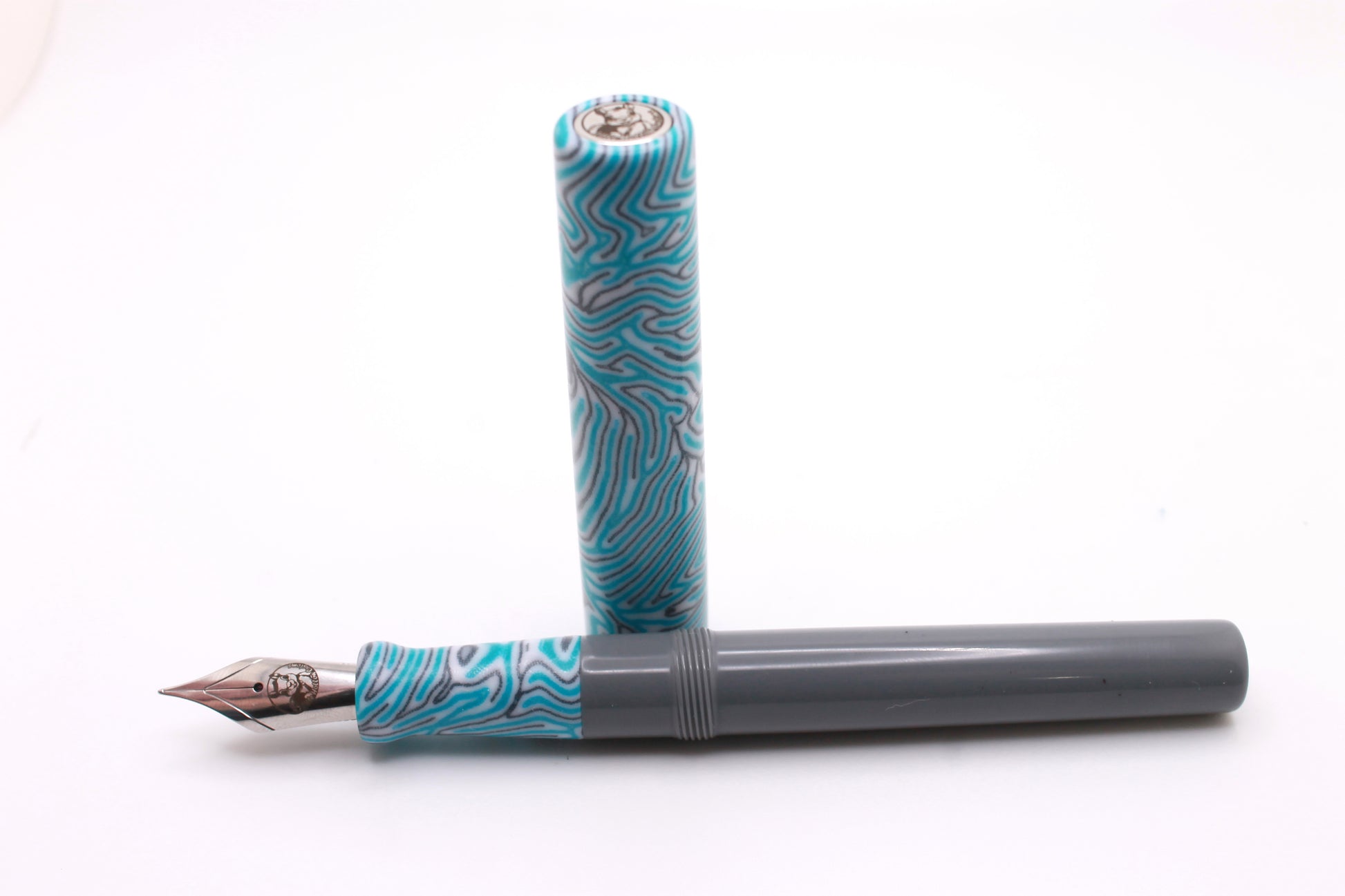 Custom fountain pen in the Little Miss model made from Blue Lagoon CrazyFiber and Grey Resin.