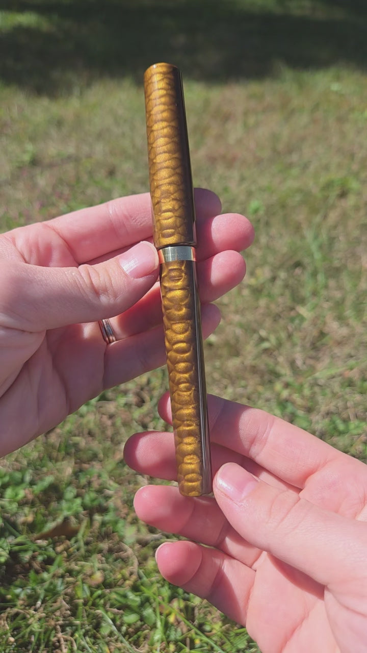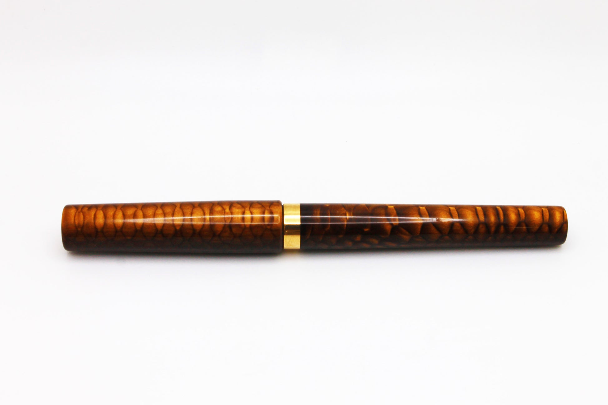 Hand crafted fountain pen in the Mistress model (non-posting) made from a Golden Dragon Juma with a brass section, band, and finial.