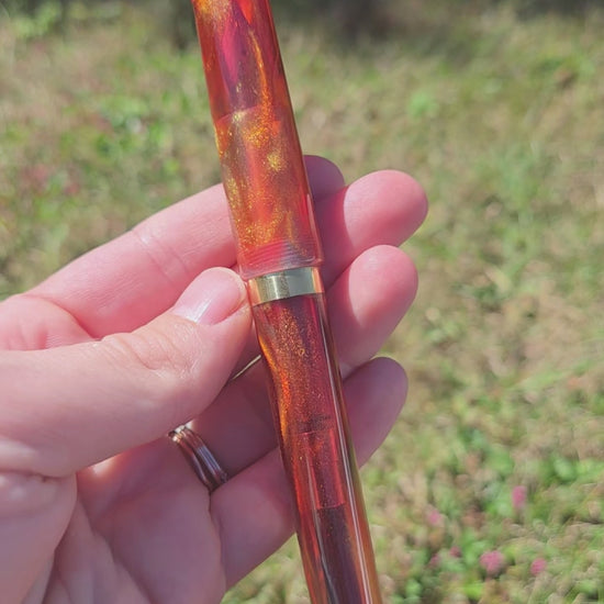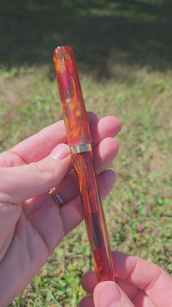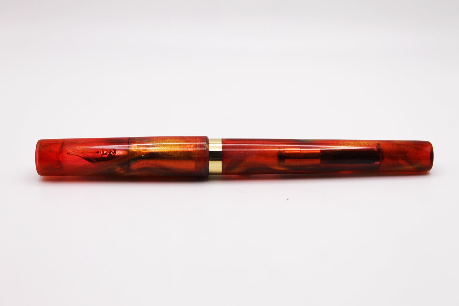 Hand crafted fountain pen in the Mistress model (non-posting) made from Pourly Controlled's Fawkes Tail resin with a brass section, band, and finial.