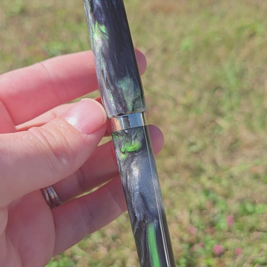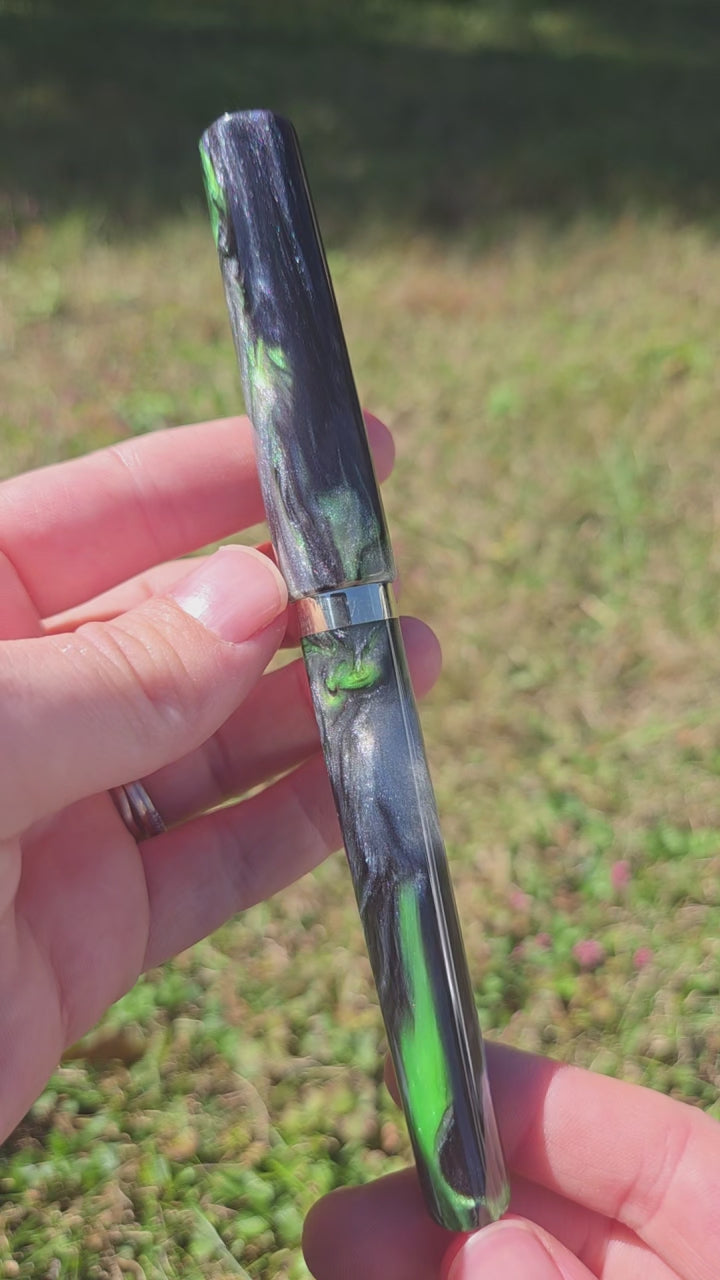 Hand crafted fountain pen in the Mistress model (non-posting) made from a Brooks Blanks Ion Storm resin with a nickel silver section, band, and finial.