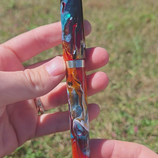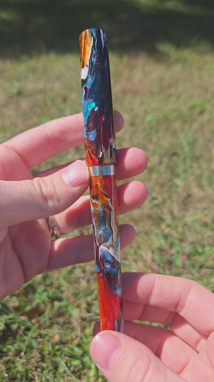 Hand crafted fountain pen in the Mistress model (non-posting) made from Turnt Pen Co Painted Desert resin with a nickel silver section, band, and finial.