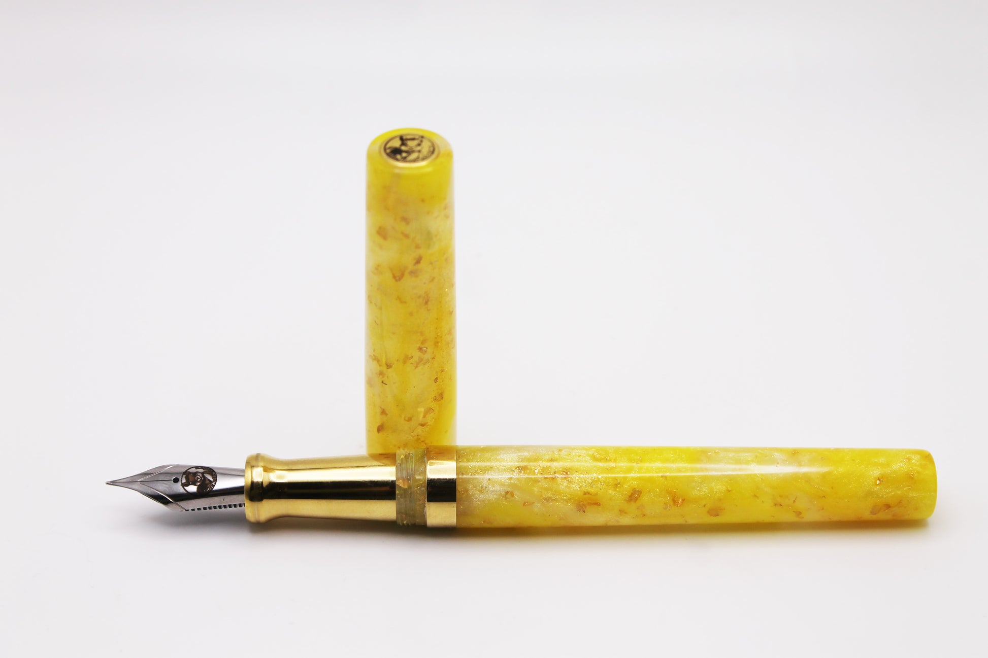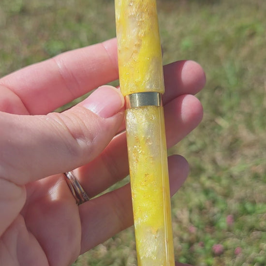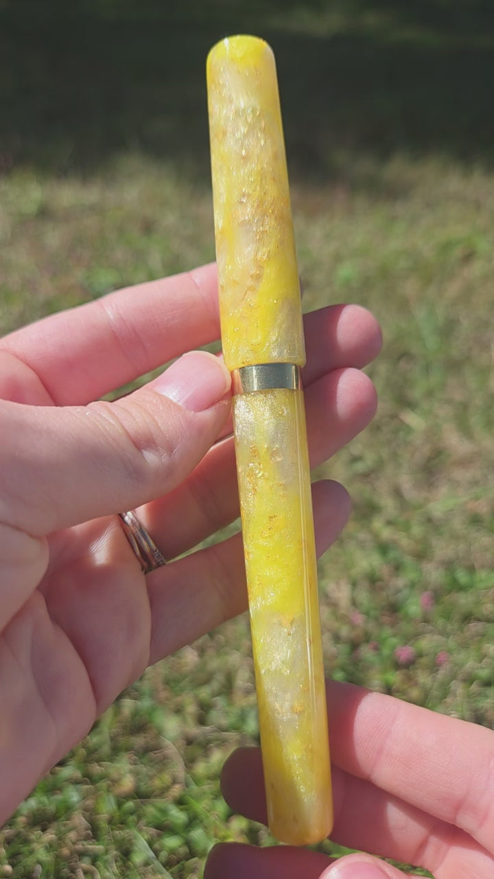 Hand crafted fountain pen in the Mistress model (non-posting) made from a Gilded Tulip resin from PapaJ Studio with a brass section, band, and finial.