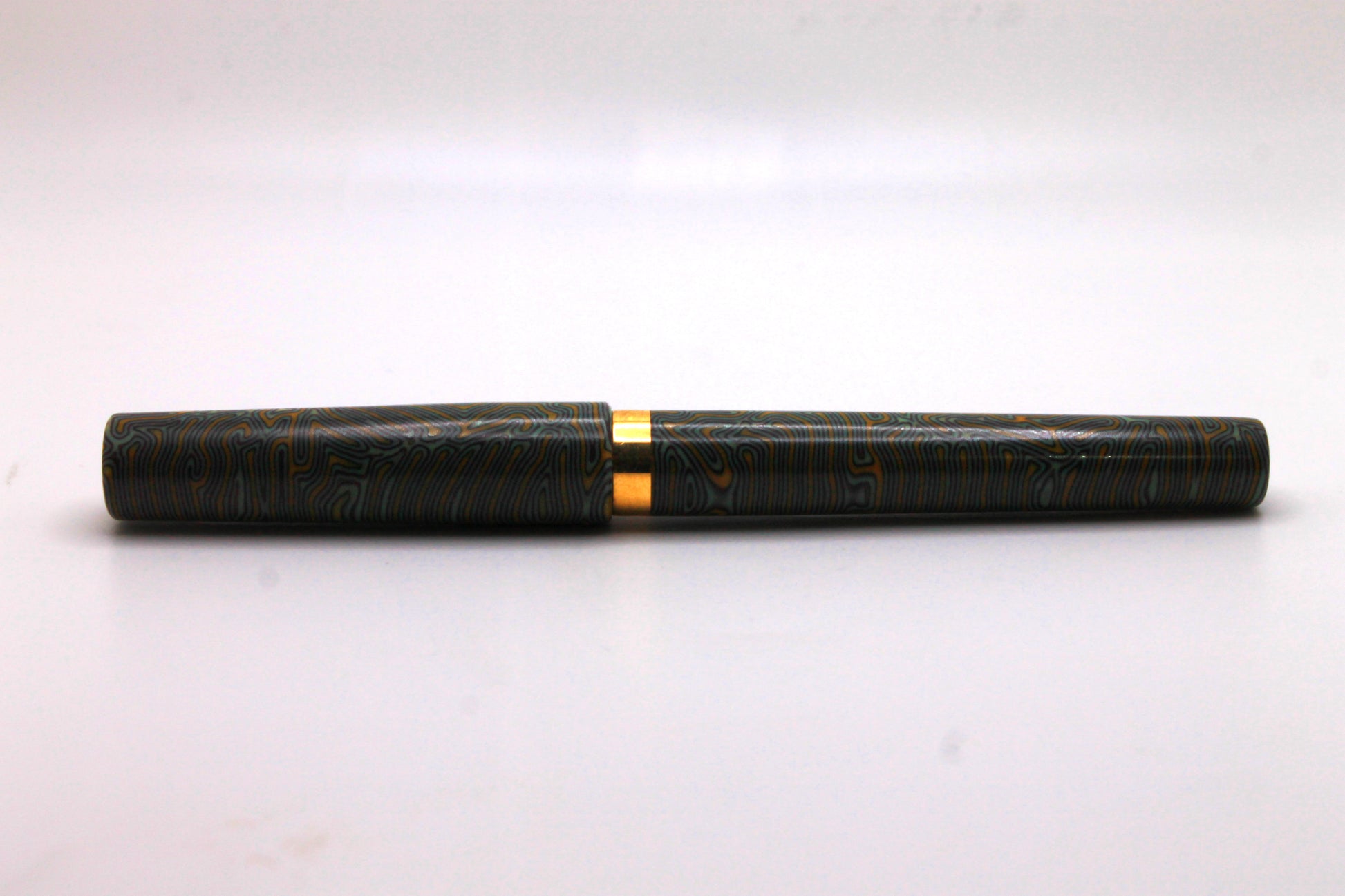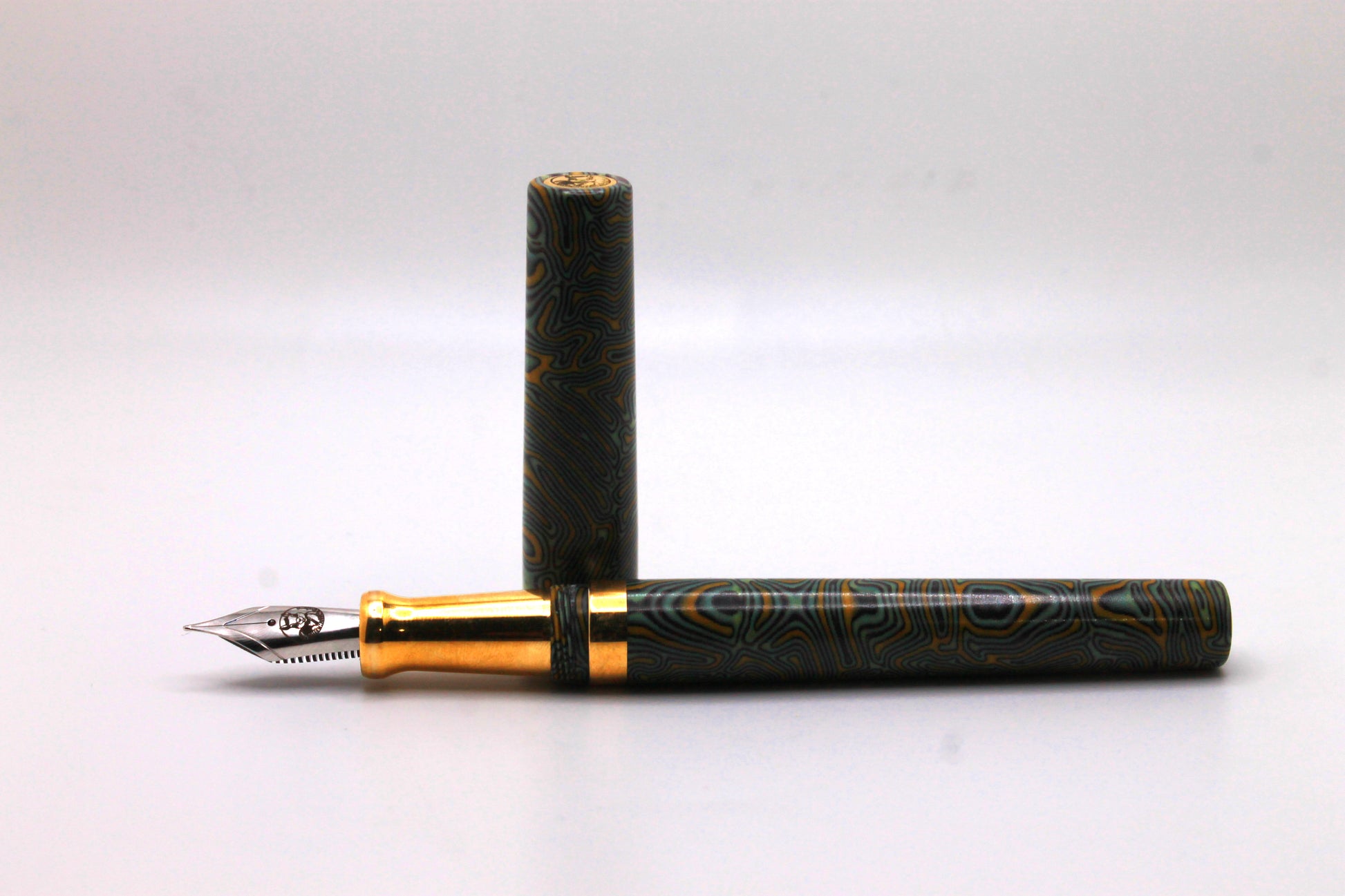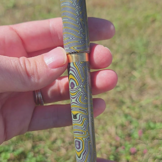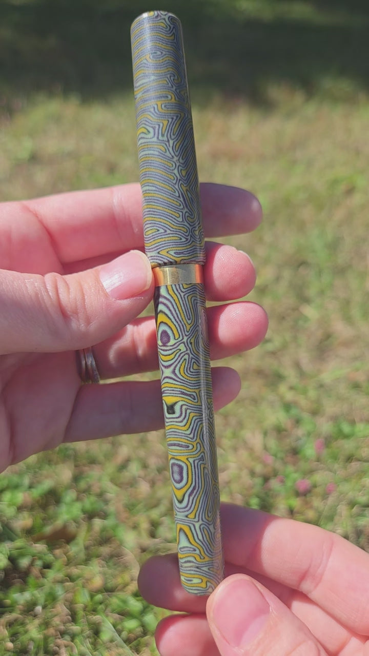 Hand crafted fountain pen in the Mistress model (non-posting) made from green yellow and purple CrazyFiber micarta with a brass section, band, and finial.