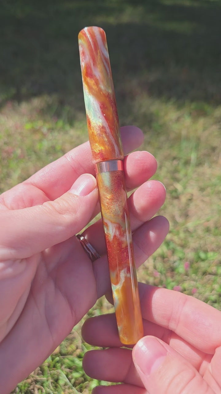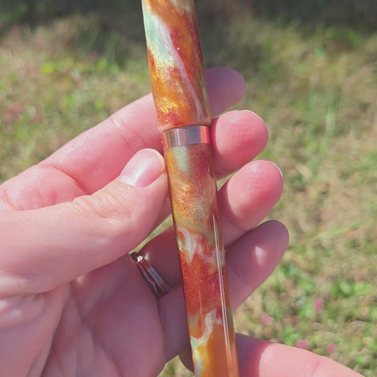 Hand crafted fountain pen in the Mistress model (non-posting) made from Pourly Controlled's Copper Patina resin with a copper section, band, and finial.