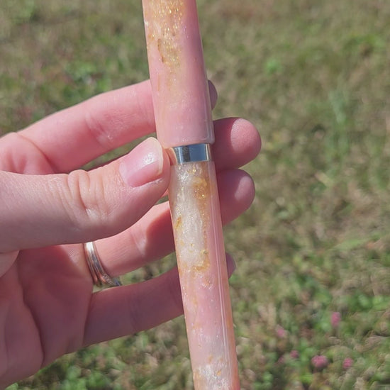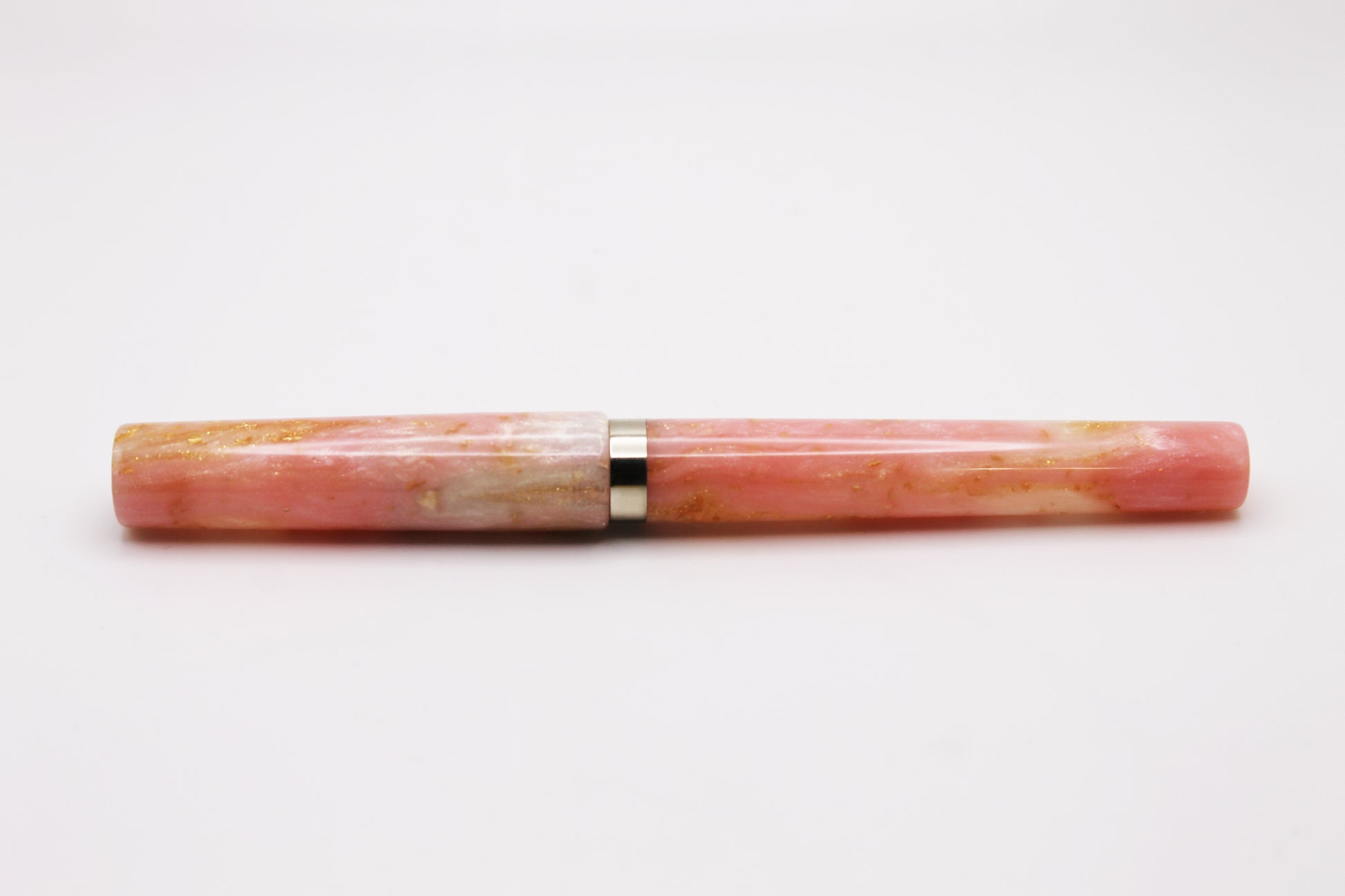Hand crafted fountain pen in the Mistress model (non-posting) made from Twin Goddess resin by PapaJ Studios with a Nickel Silver section, band, and finial.