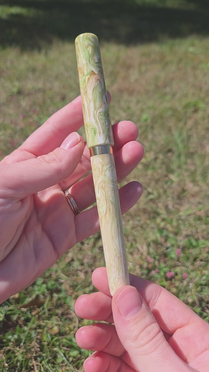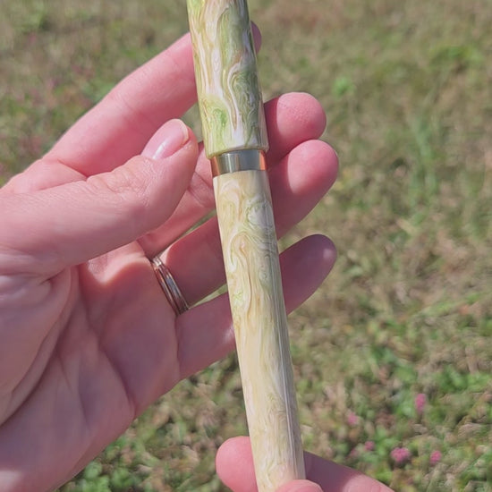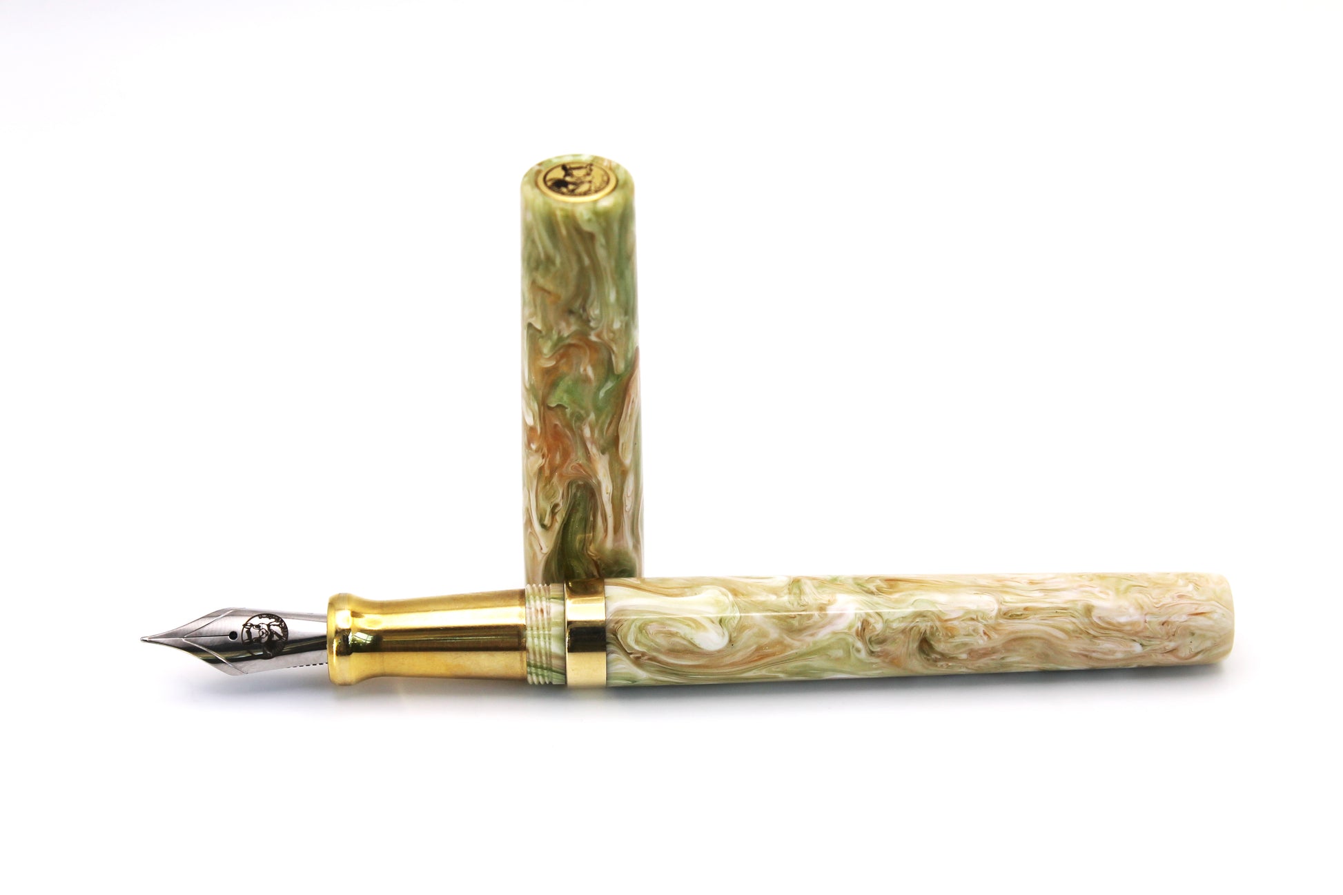 Hand crafted fountain pen in the Mistress model (non-posting) made from a green resin from Once Upon a Blank with a brass section, band, and finial.
