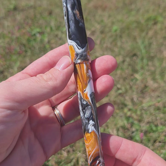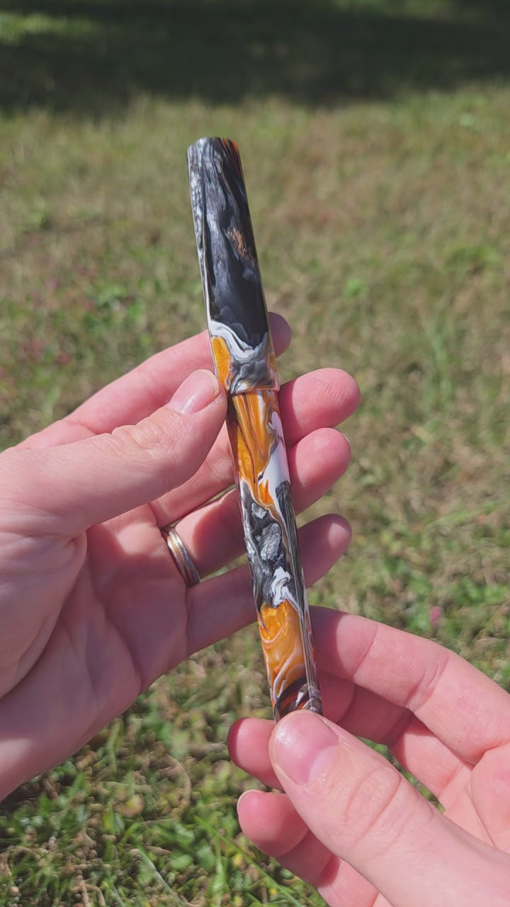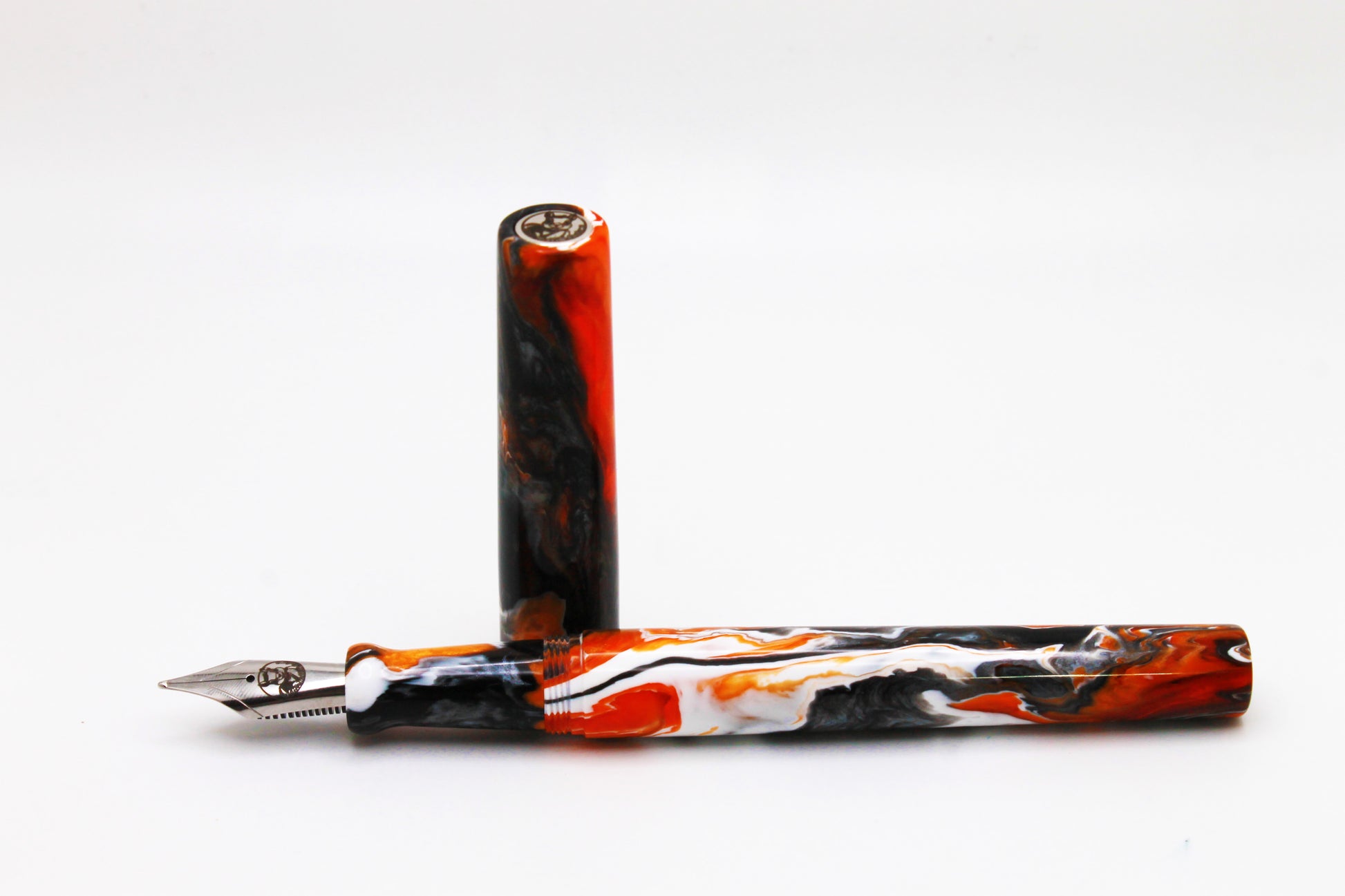 Custom fountain pen in the Mistress model (non-posting) made from Turnt Pen Co Hallows' Eve resin.